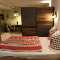 Das 1-Zimmer-Apartment befindet sich im ehemaligen Kuhstall im Bauernhaus. Mit Blick auf den neuen Stall und dem Hofladen um die Ecke kann der Urlaub zu zweit genossen werden. Die Wohnung liegt ebenerdig im Erdgeschoss und besteht aus einem Zimmer mit Doppelbett, gut ausgestatteter Küche, Sofa und Esstisch. Das Badezimmer ist durch eine Schiebetür abgetrennt.